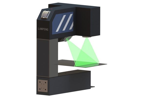 設(shè)備采用工業(yè)相機測量板材寬度。補光的線性激光垂直設(shè)置,工業(yè)相機傾斜設(shè)置,用于測量板面呈水平狀態(tài)通過的板材寬度。相機圖像的長度方向用于測量板材的寬度,圖像的寬度方向用于修正物距(被測物上下波動較大時,需增設(shè)激光位移傳感器跟蹤被測物的位置已修正物距)。設(shè)備主要配置上位機控制系統(tǒng)、外接數(shù)碼管顯示屏,根據(jù)需要可增配嵌入式智能模塊等。設(shè)備下部可配置剪刀叉升降平臺等輔助設(shè)備。