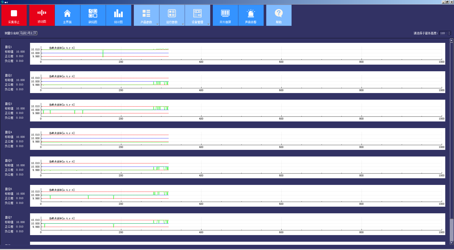 包括工具欄菜單,及主界面、波動圖、缺陷圖、統(tǒng)計圖四個數據顯示窗口。